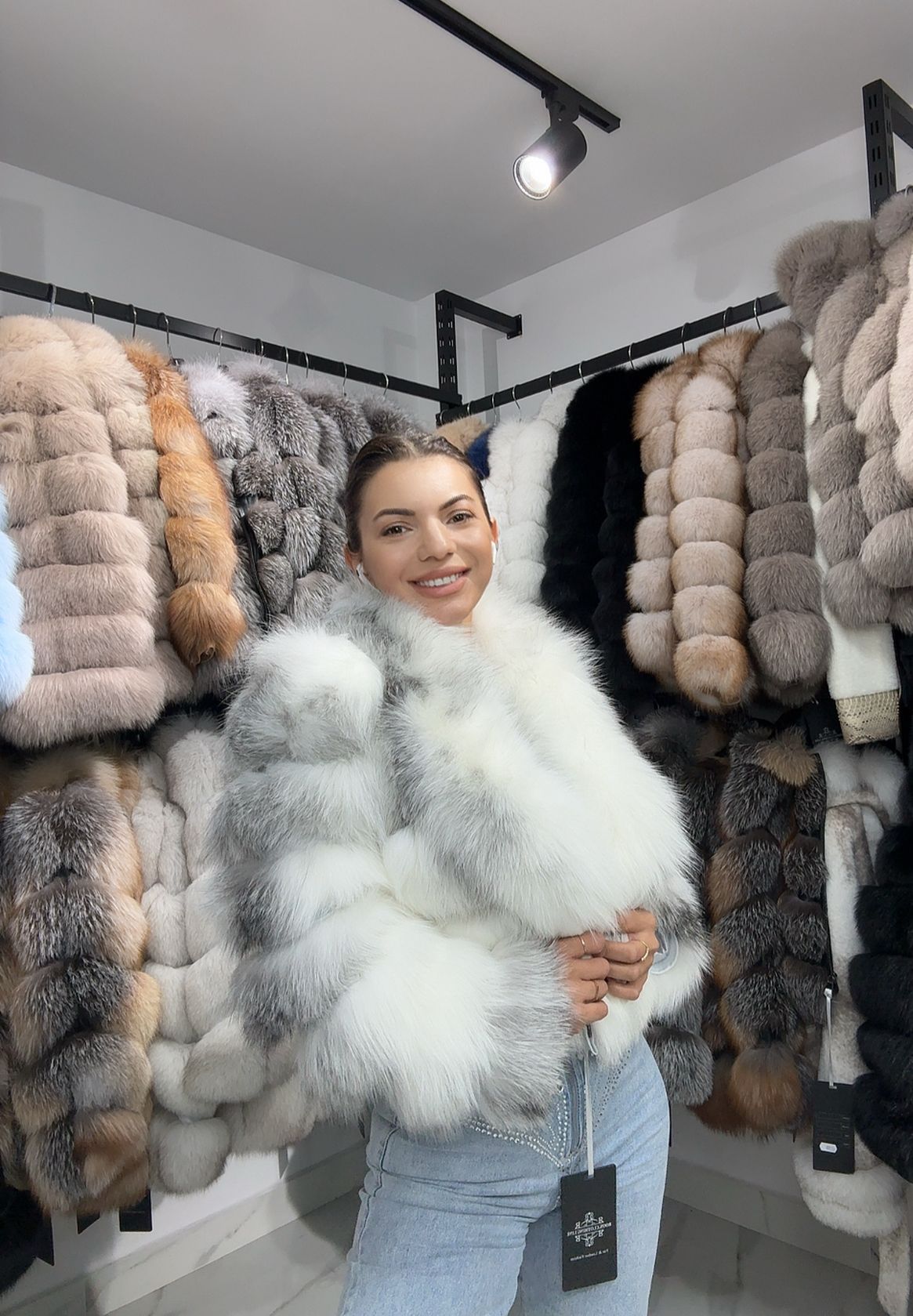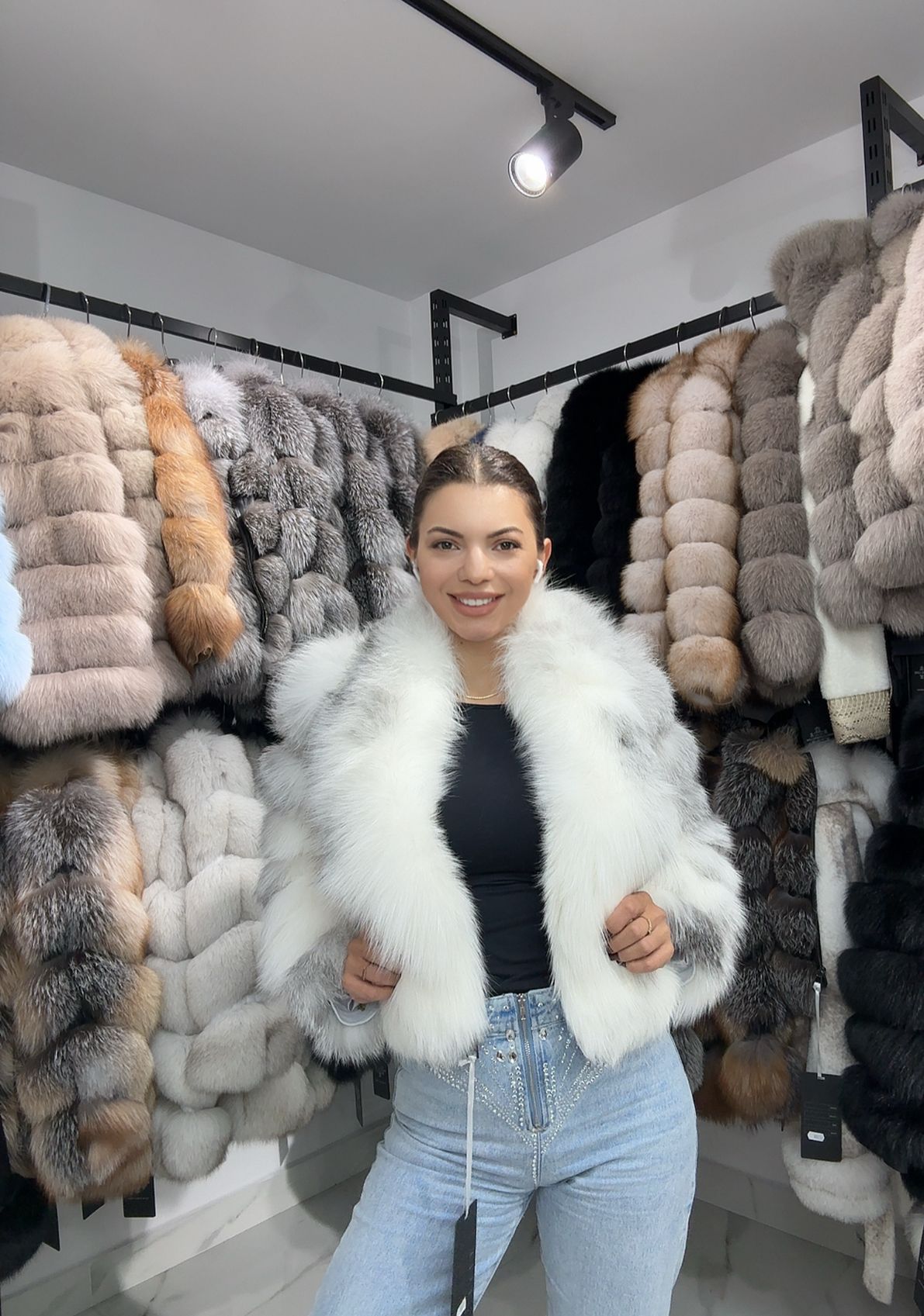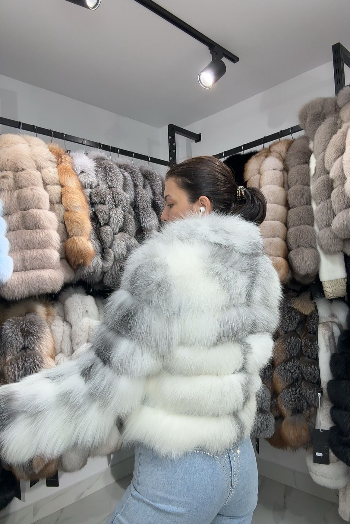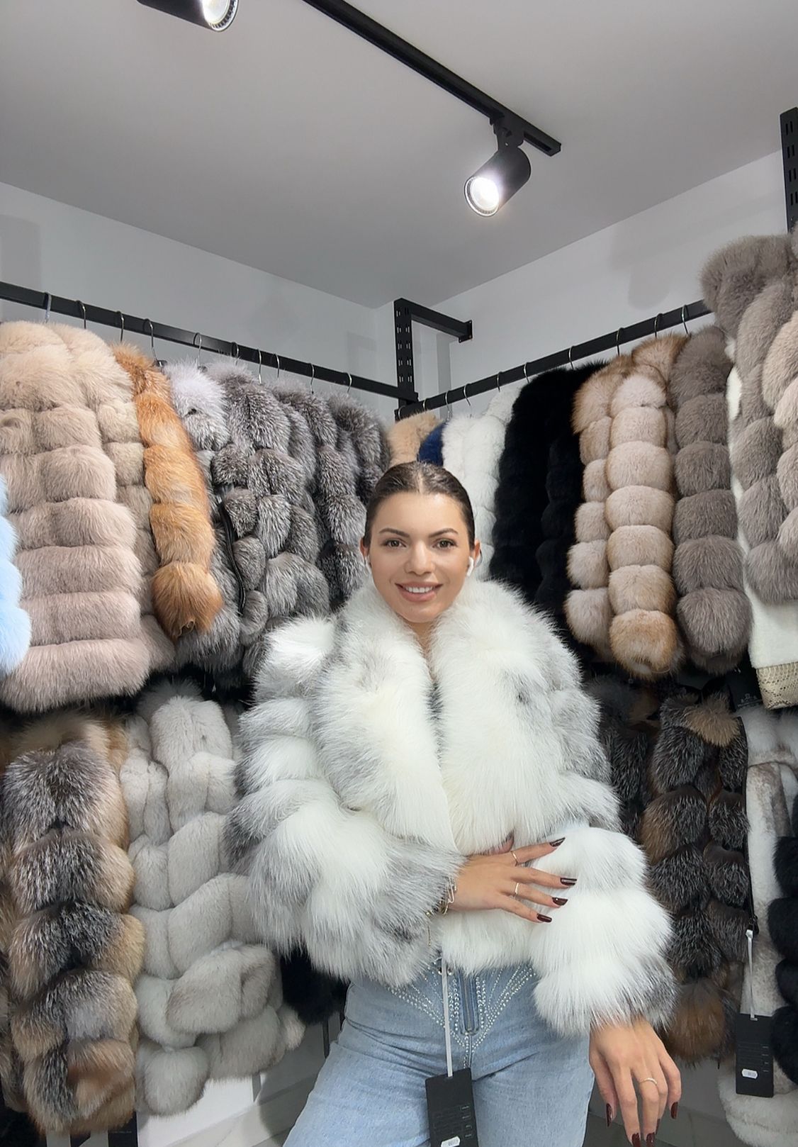 Haina de blana perfecta pentru sezonul rece – toamna tarzie si iarna. Haina este calduroasa si eleganta cu o croiala usor cambrata pe corp ce subliniza silueta.Haină de blană naturala de vulpe canadiană. Modelul poartă mărimea S