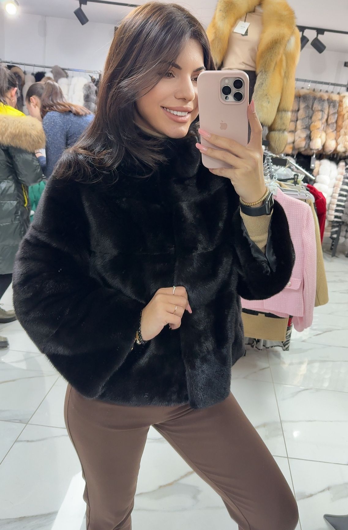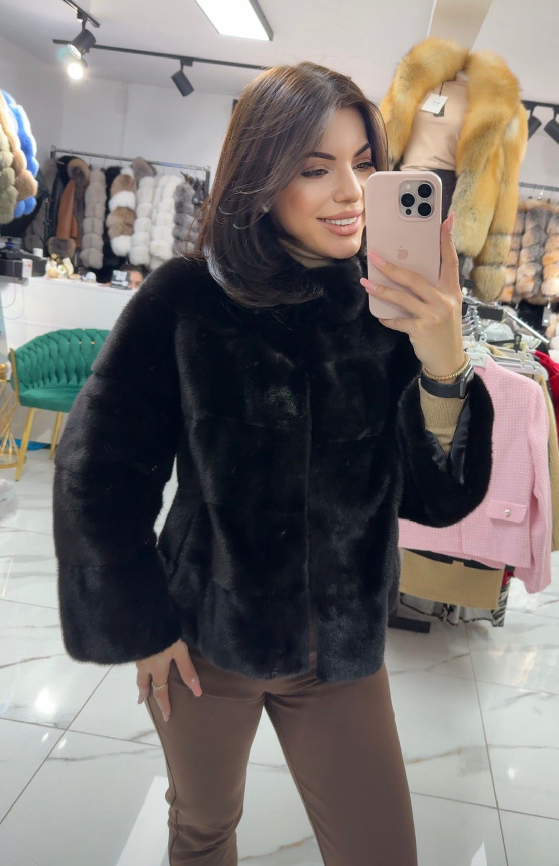 Haina de blana perfecta pentru sezonul rece – toamna tarzie si iarna. Haina este calduroasa si eleganta cu o croiala usor cambrata pe corp ce subliniza silueta.Haină de blană naturala premium de vizon BlackGlama saga .