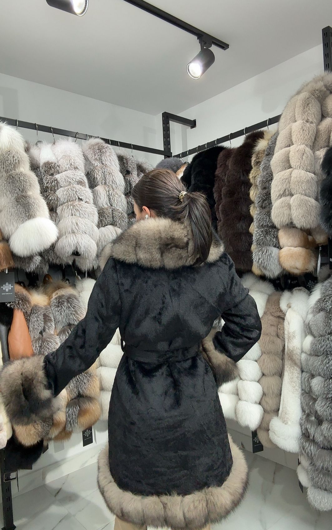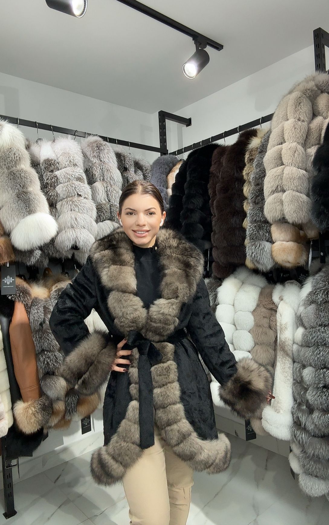 Palton perfect pentru sezonul rece – toamna tarzie si iarna. Haina este calduroasa si eleganta cu o croiala usor cambrata pe corp ce subliniza silueta.Haină din blană alcantara accesorizată cu blană naturala de vulpe polară.